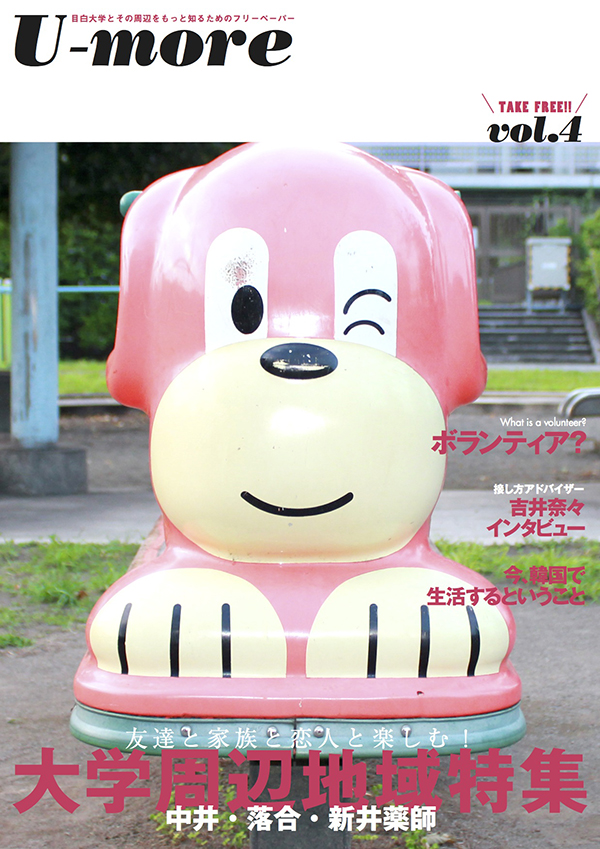 「U More」(ユーモア)というタイトルは、「あなたの(U=You)」と「大学のU=university」の「U」、それから「もっと=More」の組み合わせです。つまり、あなたにもっと大学のことを知って欲しいという意味です。近年、自らが通う大学とその周辺地域の歴史文化や活動を余り知らない、ないしは関心がない学生が増えているといいます。そこで本誌は、このフリーペーパーを読んでもらうことで少しでも目白大学とその周辺地域の文化、歴史、活動を知り、誇りに思ってもらいたいと考え創刊しました。この4号では周辺地域だけではなく、学生にとってボランティアとは何かを特集しました。