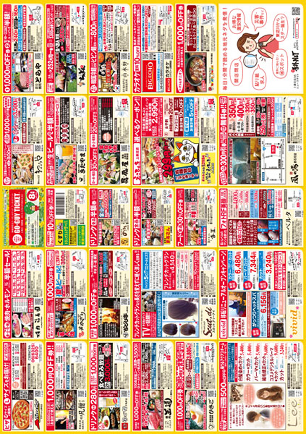 ゴーガイチケットは読者の地域での消費を楽しくする地域活性化クーポン媒体です。1エリア40,000部という狭域でエリアを展開し、より地域に密着しているため生活に有用なクーポンがたくさん載っているとご愛用いただいています。新聞折込、ポスティング、ラック設置、WEB、スマホクーポンと様々なアプローチで地域の方にお届けをしています。ミシン目付きで切り離すことができ財布にも入れやすい形状となっています。またお店の動画を作成し、QRコードなどから閲覧できる仕組みも備えています。