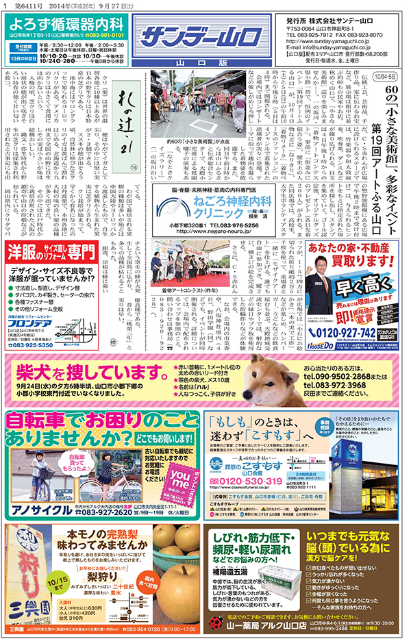 「サンデー山口」は、毎週水、金、土曜日に山口市全域に新聞5紙に折り込んでお届けしている、タブロイド判フリーペーパーです。
